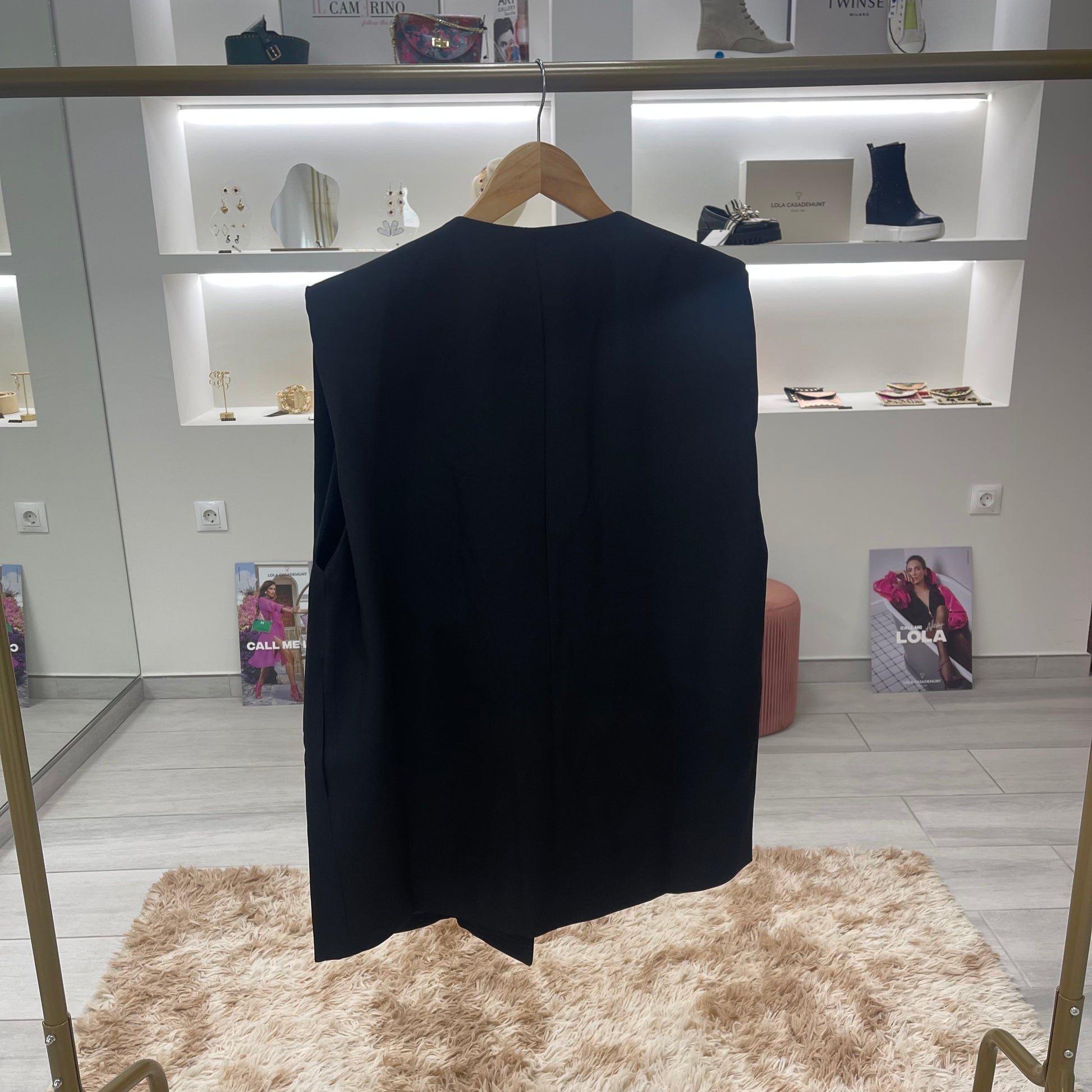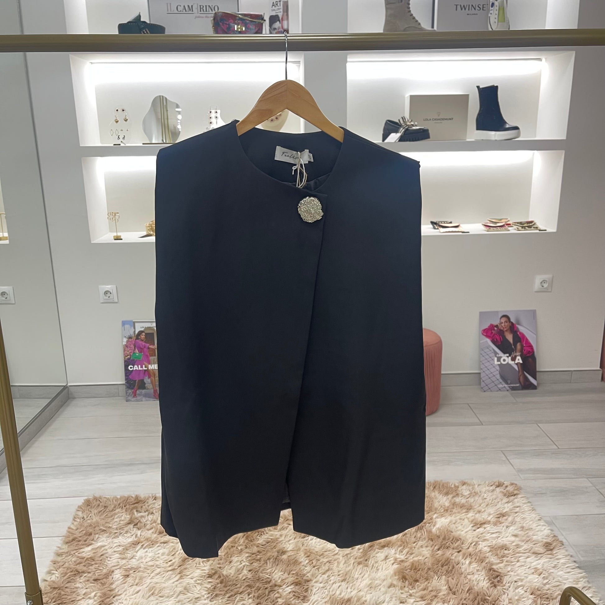CHALECO COLOR NEGRO CON HOMBRERAS,BOLSILLOS Y BROCHE FLOR PLATEADA TAMBIÉN DISPONIBLE EN BURDEOS