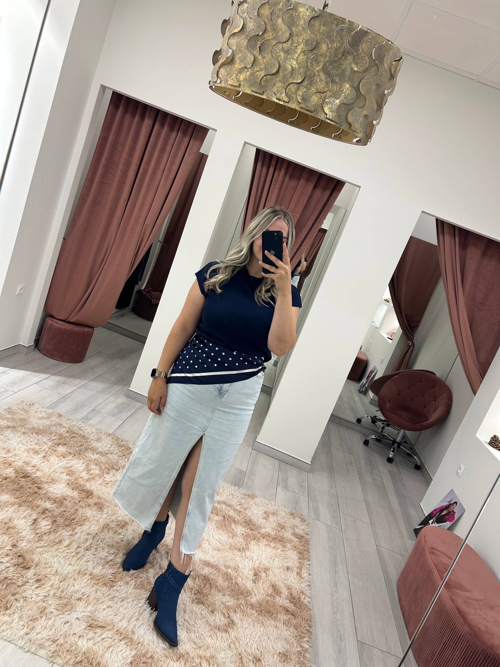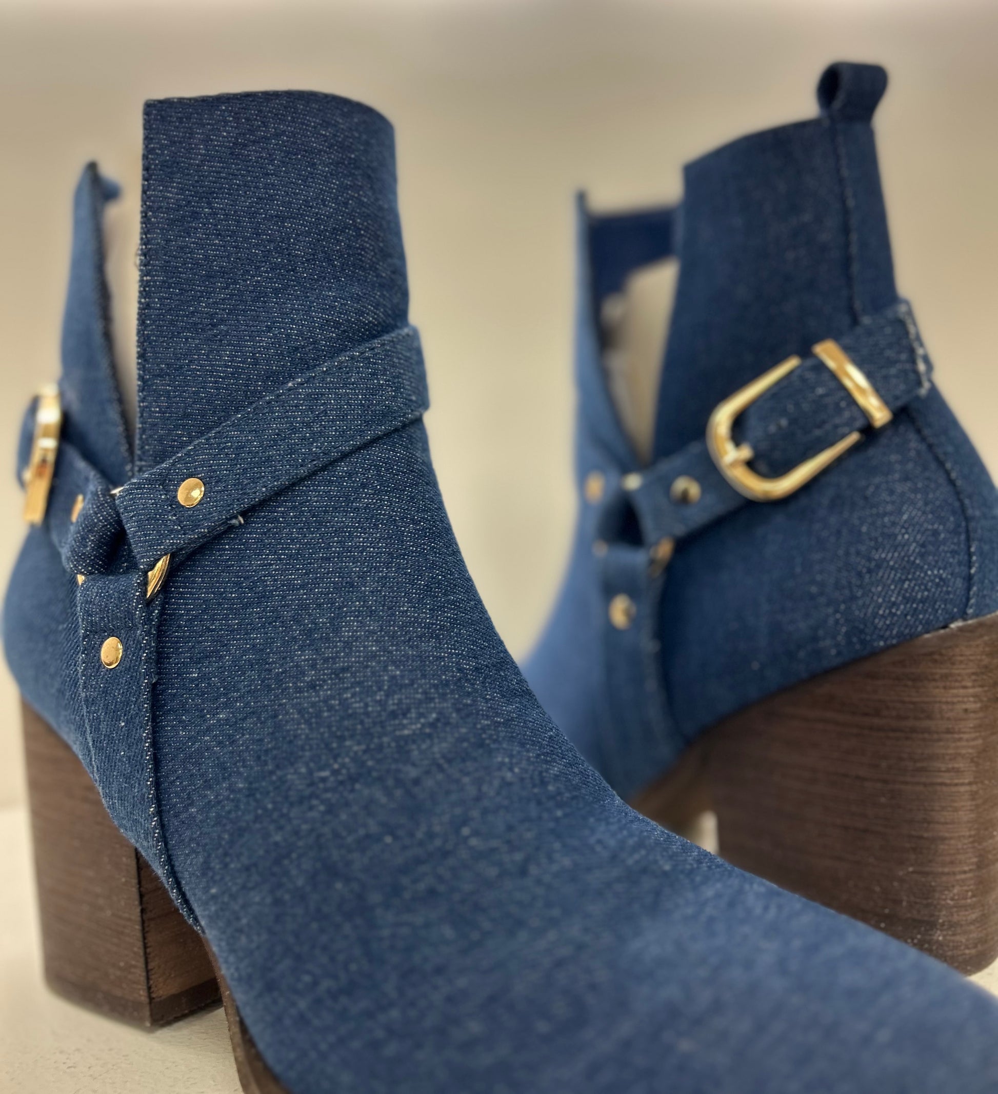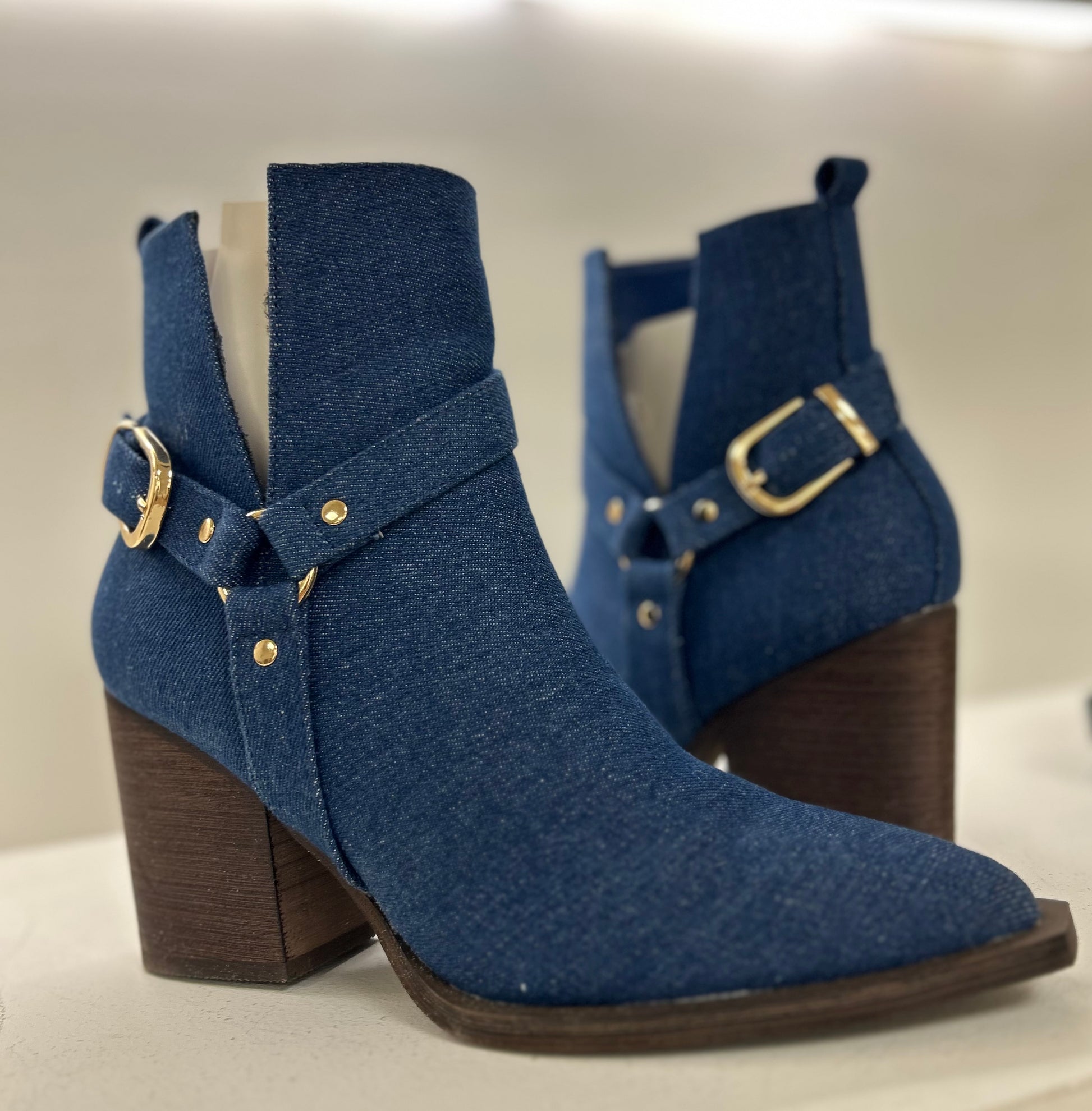 Botín de tela vaquera, tacón ancho, acabados en dorado. Cremallera lado interior.
